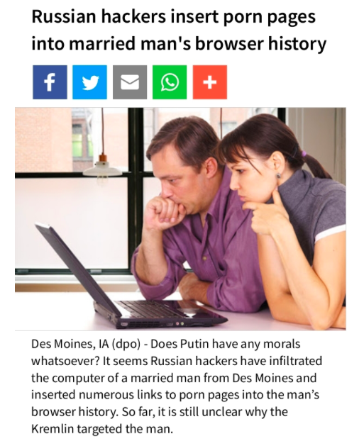 It's your weird presentation of it as some false dichotomy that it either was Russia or it wasn't. We live in an era where this is a plausible reality, and it looks like Russia probably did some stuff that might have effected the 2016 election. Once you throw in the connections with Russia the Trump administration repeatedly denied, then went back on, then denied again, then Trump Jr. tweeted out the emails, then a bunch of Trump's campaign got accused/plead guilty to connections with Russia, it looks down-right suspicious.